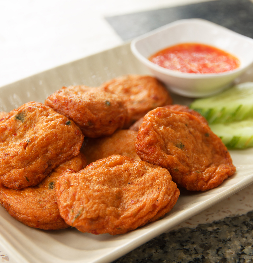 Tord Mun Pla – Deep-fried fish cakes made with the original Pla Grai fish meat imported fresh from Thailand | Served with sweet chili, cucumber and peanut sauce